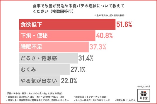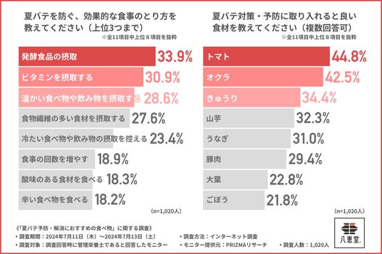 株式会社八恵堂(所在地:福岡市博多区)は、全国の管理栄養士1,020名を対象に「夏バテ予防・解消におすすめの食べ物」に関する調査を行いました。