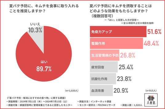 また、発酵食品の力がもたらす「免疫力アップ」や「整腸作用」などが期待され、さらにキムチの辛さによる「食欲増進」が夏バテ予防として効果が期待できると考えられていることが示されました。