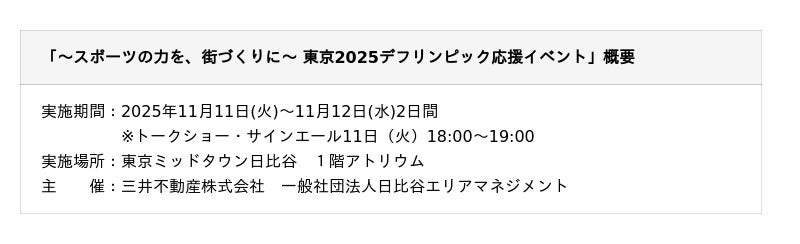 三井不動産株式会社(東京都中央区、代表取締役社長:植田俊、以下「三井不動産」)は、東京ミッドタウン日比谷(千代田区有楽町、事業者:三井不動産株式会社)にて、ソフトバンク株式会社協賛のもと、2025年11月11日(火)~12日(水)の2日間「~スポーツの力を、街づくりに~東京2025デフリンピック応援イベント」を開催いたします。本イベントは、2025年11月15日から開催されるデフリンピックに先駆け、より多くの方々にデフリンピックをはじめとしたスポーツの魅力を知っていただくためのイベントです。なお、三井不動産は東京2025デフリンピックのトータルサポートメンバーとして協賛しております。