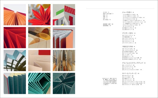 はじめに 6/紙折りに使う道具 8/材料 12/用語 16/記号 17/折りの技法 18/ジャバラ折り 26(1 2-4-8 面のジャバラ折り 30/ 2 3-6-12 面のジャバラ折り 33/ 3 エクステンションのあるジャバラ折り 35/4 シンプルなジャバラ本 36/5 別紙カバーつきジャバラ折りポケット 40/6 ジャバラ折りポケットのバリエーション 44 /7 一体表紙のジャバラ折りポケット 46/ 8 ポップアップのジャバラ折り 50/9 フラッグブック 54/10 両面フラッグブック 59 / 11 交差するループ 62) /ブリザード折り 66 (12 ブリザードブック 70 / 13 幸運の風車 74/ 14 ブリザードボックス 77 / 15 クラウンブック 82/ 16 クラウンカード 86/ 17 ブリザードポケット 88)/1 枚仕立ての本 92 (18 フランクリン折り 96 / 19 トライアングルブック 100/ 20 四方開きの地図折り 104/ 21 フィッシュボーン折り 108/ 22 ツリー折り 112/ 23 斜めポケット 116/ 24 冊子折りとバリエーション 3 種 120 / 25 冊子折りの星形ポップアップ 124)/アルバムとスクラップブック 128(26 パノラマブック 132/ 27 スパイダーブック 136/ 28 ピアノヒンジ 141/ 29 ピアノヒンジつきジャバラ折り 144)/カバーとパッケージ 148 (30 ボタンポーチ 152 / 31 スリング折り 156 / 32 伸縮ピラミッド 162/ 33 スターボックス 166/ 34 スクールブックカバー/プリーツつき 172 / 35 部分カバーとフルカバーの差し込み函 176 / 36 カイルラッパー(蓋つきくるみ箱) 184)/著者略歴・謝辞 190 /監修者解説 191