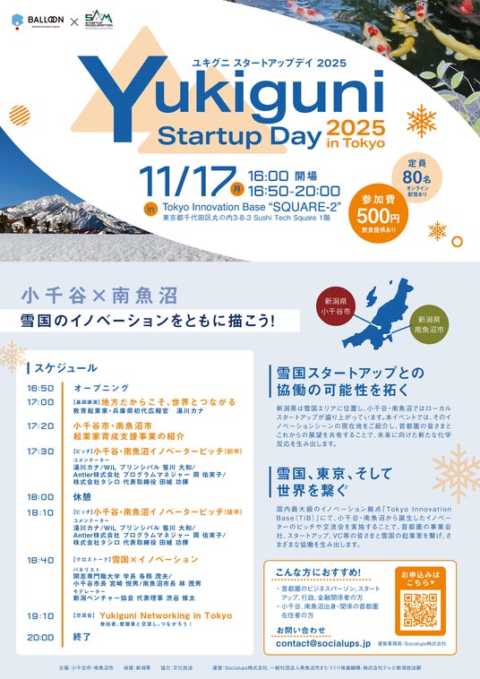 2025年11月17日(月)、Socialups株式会社(本社:新潟県新潟市中央区、代表取締役社長:高瀬 章充)は、Tokyo Innovation Base(東京都、有楽町駅そば)にて、新潟県小千谷市と南魚沼市が主催する「Yukiguni Startup Day 2025」を運営します。