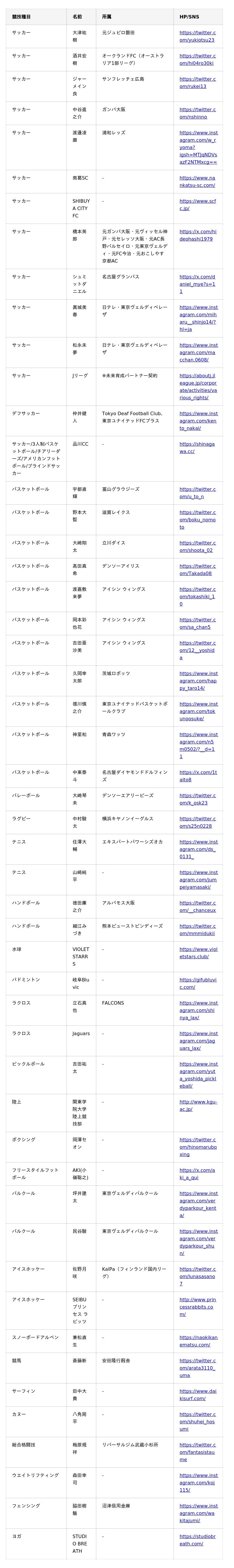 <BASE UP SPORTS サプライヤー契約一覧(現時点)>