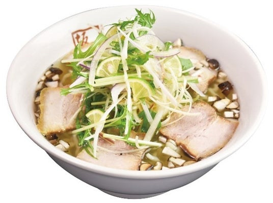 【商品の特徴】すだち、椎茸、みょうがの旬食材、さらにキャベツ、水菜、白髪ねぎ、赤玉ねぎを使用し、特製焼豚5枚を添えた季節限定商品。椎茸を炙って香ばしさを際立たせ、野菜と和えたすだちが爽やかな味わいを引き出します。