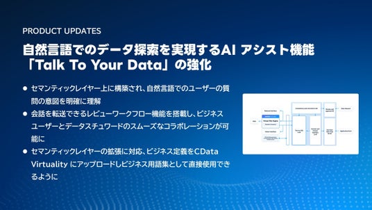 2025年10月30日、CData Software Japan 合同会社(本社:米国ノースカロライナ州、日本オフィス:宮城県仙台市、代表社員 職務執行者:疋田 圭介、以下CData)は、データ仮想化プラットフォーム『CData Virtuality』のアップデートCData Virtuality 2025.Q3 をリリースしました。今回のアップデートでは、自然言語でのデータ探索を実現するAI アシスト機能「Talk To Your Data」の強化、データカタログ「Business Data Shop」へのデータリクエスト機能の追加、ID とアクセス管理を一元化する認証管理コンポーネントの導入などが含まれます。これらのアップデートにより、CData Virtuality はガバナンスとセキュリティを保ちながら、AI 機能によって強化されたデータ分析基盤を提供します。