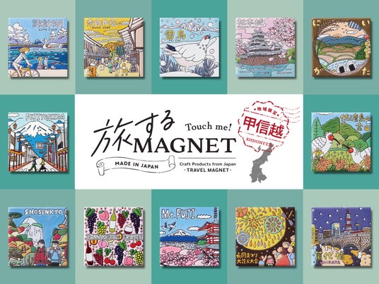 地球や社会の課題解決につながるものづくりを行う株式会社ペノン(本社:東京都千代田区)が展開する『旅するマグネット』は、日本の全国各地で活躍する“ご当地クリエイター”とタッグを組み、各地域の観光名所や歴史・文化をテーマにしたイラストをサステナブル素材のマグネットに落とし込んだ、地域共創型の新しい仕組みのおみやげです。このたび、甲信越3県(山梨・長野・新潟)の絵柄が出揃い、甲信越エリアのコンプリートを達成しました。