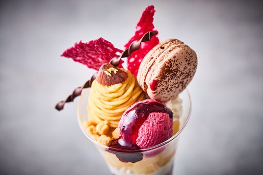 洋梨はフレッシュやコンポート、ゼリー、茨城県産笠間の栗は渋皮煮やババロワ、クリームにして重ね、食感や味わい、風味を変えて最後まで楽しく食べ進めることができるように仕上げました。アクセントにカシスを用い、ソースやシャーベット、レース状の薄いクッキーにして取り入れることで甘酸っぱさも加えました。軽くふんわりとした食感が特徴のビスキュイショコラを間に挟むことで全体を調和させ、さらにトップにマカロンショコラを飾り華やかさもプラスした、美しいビジュアルと大人な味わいのパフェをご賞味ください。■期間:2025年11月1日(土)~12月31日(水)