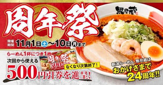 株式会社キタカタ(本社:新潟県新潟市)が運営する、新潟発祥のらーめん店「無尽蔵」は、創業24周年を迎えます。日頃のご愛顧に感謝し、2025年11月1日(土)より、周年記念メニュー『海老みそらーめん』(税込1,150円)を全国の22店舗で期間限定販売いたします。甘海老の頭から丁寧に抽出した濃厚スープと、新潟の歴史ある醸造所が作るみその芳醇なコクが重なり合う、特別な一杯です。また、同日より次回ご来店時に使える「500円券」を数量限定で配布いたします。無くなり次第終了となりますので、お早めにご来店ください。