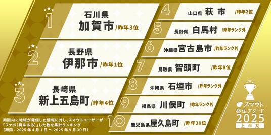 株式会社カヤック(本社:神奈川県鎌倉市、代表取締役CEO:柳澤大輔、東証グロース3904)は、自社が運営する地域とつながるプラットフォーム「スマウト」において、移住希望者の興味・関心を集める人気地域をランキング化した「スマウト移住アワード2025上半期」を、10月30日(木)に発表しました。