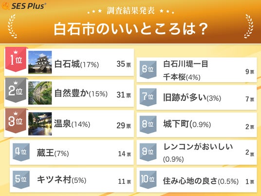 次いで、4位「蔵王(14票)」、5位「キツネ村(11票)」、6位「白石川堤一目千本桜(9票)」、7位「旧跡が多い(7票)」、8位「城下町(2票)」、9位「レンコンがおいしい(2票)」、10位「住み心地の良さ(1票)」というランキング結果になりました。