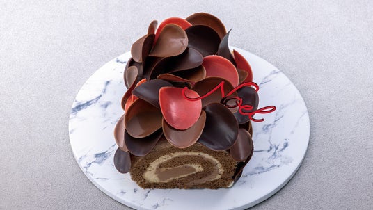 濃厚で香り高いカカオ80%のチョコレートムースの中に白ごまのブリュレを忍ばせ、艶やかなグラサージュショコラで包み込みました。カカオニブ入りのサブレを土台に、トップはチョコレートでアートのように美しく仕上げたノエルショコラです。