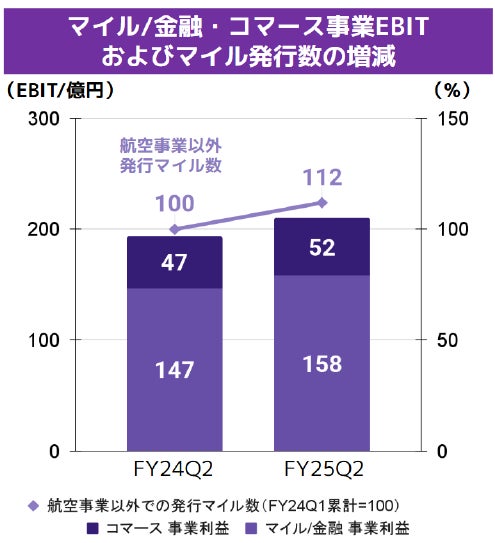 旅客数の増加に加えてJALカード決済額の増加に伴う発行 マイル数の増加などにより、売上収益は前年比+9.4%の 1,079億円、EBITは前年比+8.3%の210億円となり、 安定的に利益を伸ばしています。