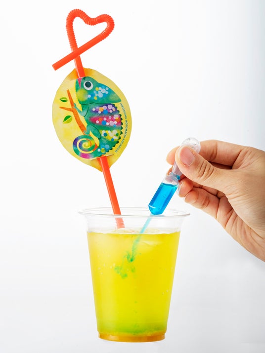 エボシカメレオンの特性である、体色の変化と長い舌を表現した、マンゴー&レモン味のトロピカルドリンクです。別添えのスポイトの青色シロップを入れてくるくるかき混ぜると、まるでカメレオンのように色が変わり、オーロラ状の模様がゆらめきます。ストローの形も自由に変えられます。