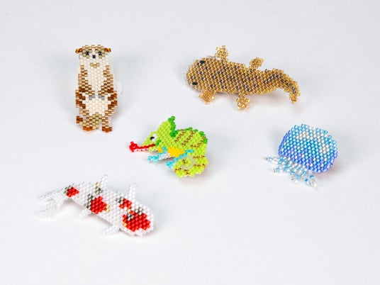 広島のグラスビーズメーカーのトーホー株式会社が作る、水族館オリジナルデザインのきらきらしたビーズブローチ。ひとつひとつ丁寧にハンドメイドされ、普段のおでかけにも身につけられる上品なアイテムです。ミズクラゲ/エボシカメレオン/ニシキゴイ/オオサンショウウオ/ミーアキャット