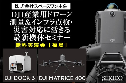 DJI(ディージェイアイ)正規販売代理店としてドローンビジネスの最先端を支える株式会社セキド(本社:東京都港区、代表取締役:大下貴之、以下「セキド」)は、株式会社スペースワン(本社:福島県郡山市、代表取締役:小林康宏)と共催で、2025年11月28日(金)に福島県郡山市で、最新の産業用ドローンを実演・紹介する無料セミナー「DJI産業用ドローン 測量&インフラ点検・災害対応に活きる最新機体セミナー」を開催いたします。