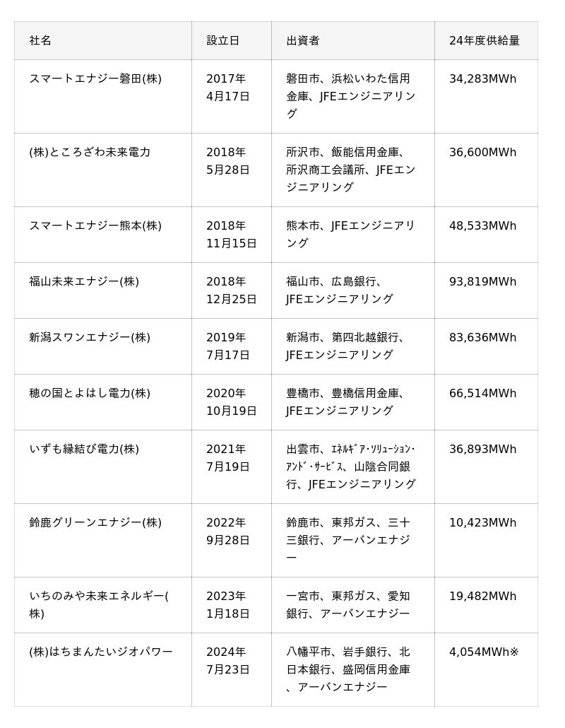 磐田市(スマートエナジー磐田(株))、所沢市((株)ところざわ未来電力)、熊本市(スマートエナジー熊本(株))、福山市(福山未来エナジー(株))、新潟市(新潟スワンエナジー(株))、豊橋市(穂の国とよはし電力(株))、出雲市(いずも縁結び電力(株))、鈴鹿市(鈴鹿グリーンエナジー(株))、一宮市(いちのみや未来エネルギー(株))、八幡平市((株)はちまんたいジオパワー)