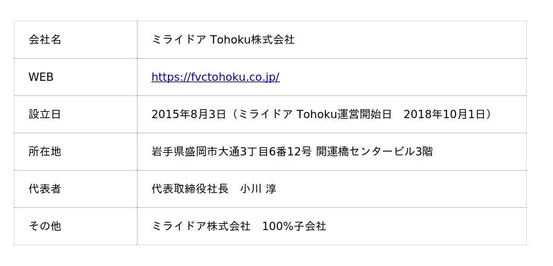 出資者:ゼノアックホールディングス株式会社、株式会社東邦銀行、株式会社大東銀行、株式会社福島銀行、郡山信用金庫、株式会社エフコムホールディングス、ミライドア Tohoku