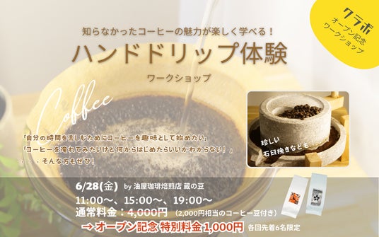 コーヒー愛好者に向けて、6月28日(金)11時~ 15時~ 19時~ の3回開催 (各回6名限定)