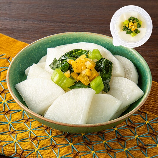 山梨県富士川町産のゆずは標高が高く豊富な日射量により豊かな香りが特長です。ゆず果汁で漬け込んだ大根にゆず皮をのせ、さっぱりと食べ進められる仕立てです。