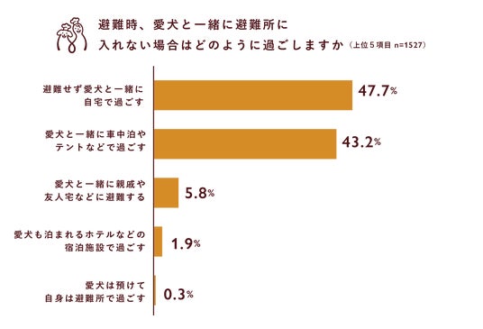 - 愛犬と離れて避難することを想定している飼い主は全体のわずか0.3%で、ほとんどの飼い主が同伴避難所がない場合でも愛犬と一緒に過ごすことを想定している。