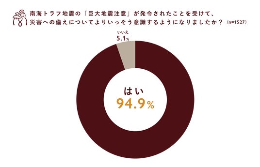 - 南海トラフ地震「巨大地震注意」が発令されたことを受けて、災害への備えについてよりいっそう意識するようになった飼い主は94.9%。