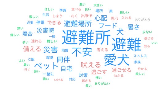 飼い主の不安や意見として、最も頻出した単語は「避難所」「避難」でした。避難所に入れない懸念から自宅避難を想定している飼い主も多く、「フード」という単語も頻出しました。停電による「暑さ」への対策、愛犬の「ストレス」の心配や「吠え」に関する記述も多く見られました。