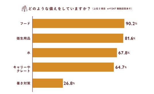 - 愛犬のための備えとして最も多いものはフード類、ついでトイレシートやマナーウェアなどの衛生用品、水。