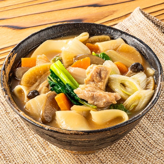 群馬県を代表する郷土料理のおきりこみ。もちもちとした食感の幅広麺を、野菜と鶏肉の旨みのあるつゆで煮込んだうどんです。