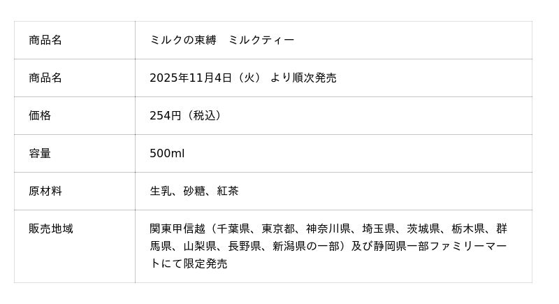 古谷乳業株式会社(本社:千葉県千葉市/代表取締役社長:古谷裕彦/以下「古谷乳業」)と株式会社カヤック(本社:神奈川県鎌倉市/代表取締役CEO:柳澤大輔/以下「面白法人カヤック」)の共同開発による『ミルクの束縛 ミルクティー』が、関東甲信越及び静岡県の一部ファミリーマートで2025年11月4日(火)より順次販売します。