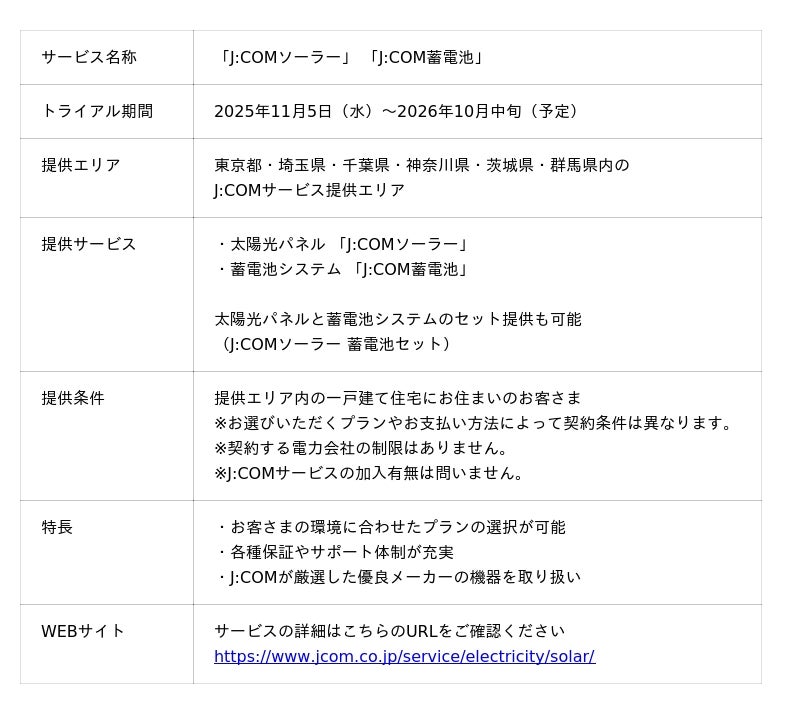 JCOM株式会社(J:COM、本社:東京都千代田区、代表取締役社長:岩木 陽一)は、エネルギー事業の新たなサービスとして、太陽光パネルを設置する「J:COMソーラー」と、電気をため必要時に使用できる「J:COM蓄電池」のトライアル提供を、東京都・埼玉県・千葉県・神奈川県・茨城県・群馬県内のJ:COMサービスエリアにて、2025年11月5日(水)より開始します。