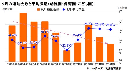 一方、昨今の温暖化現象により平均気温が上昇しており、2023年の平均気温は9月で26度となり、10年前より2度も上昇。運動会が「秋晴れ」の季節から、「涼しくなった晩秋」に移行している実態が浮かび上がりました。
