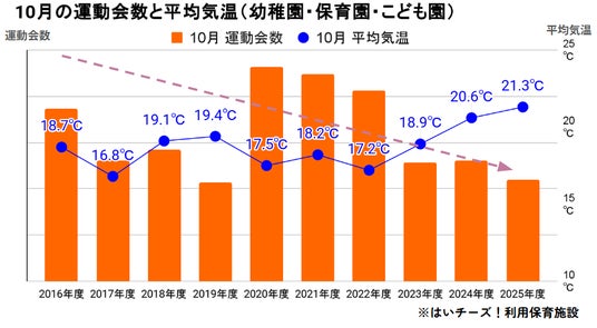 写真と食の力で子どもの幸せを創ることを目指す総合保育テックサービス「はいチーズ!」を提供する千株式会社(本社:東京都千代田区、代表取締役社長 千葉伸明、以下 当社)は、全国の幼稚園・保育園・こども園における過去10年間(2016~2025年)の運動会データを独自に分析しました。