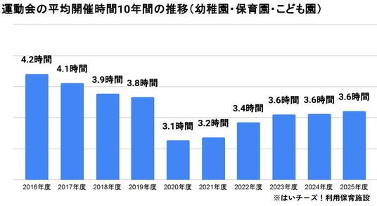 2020年のコロナ禍で、感染防止のため午前中のみ開催とする園が急増。その結果、平均開催時間は2020年度の3.1時間が過去10年で最も短くなりました 。
