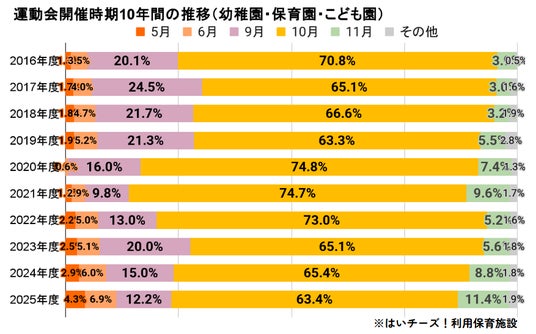 2016年当時は運動会のピークは9~10月でしたが、近年は9月開催が大きく減少。2025年度には9月開催が10年前より約8ポイント減少し、11月開催は約3倍増加しました。