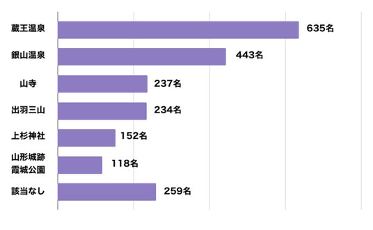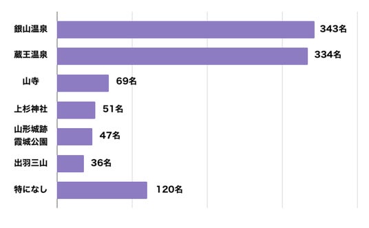 次いで「蔵王温泉」が33.4%と拮抗し、「山寺」6.9%、「上杉神社」5.1%、「山形城跡・霞城公園」4.7%、「出羽三山」3.6%と続きます。