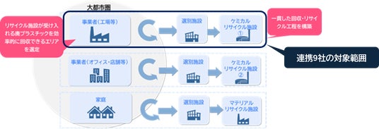 本実証事業のうち、連携9社は、「大都市圏」において、工場から排出される廃プラスチックを対象に、分別・回収からケミカルリサイクル、再生材製造に至るまでの一貫したサプライチェーンの実証を行います。各社の専門領域を活かし、大都市圏における効率的かつ高品質な資源循環モデルの構築を目指します。各社の主な役割は以下の通りです。