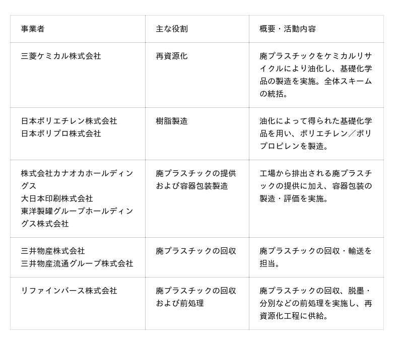 三菱ケミカル株式会社、日本ポリエチレン株式会社、日本ポリプロ株式会社、株式会社カナオカホールディングス、大日本印刷株式会社、東洋製罐グループホールディングス株式会社、三井物産株式会社、三井物産流通グループ株式会社、リファインバース株式会社は、経済産業省「令和7年度 資源自律経済確立産官学連携加速化事業費(広域自治体における資源循環システムの構築に向けた実証事業)」に参画し、大都市圏における、地域特性に応じた資源循環システムの構築に向け、再生プラスチックを中心とした再生材の大規模供給体制に関する課題を分析・検証します。