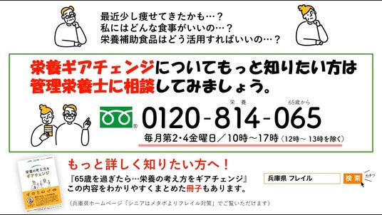 また現在、兵庫県栄養士会による電話相談窓口「栄養ギアチェンジ相談室」を毎月第2・4金曜日に開設。兵庫県内の方限定で、相談を受け付けています。 【電話番号:0120-814-065】