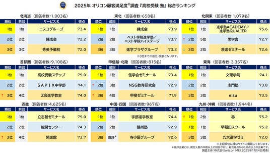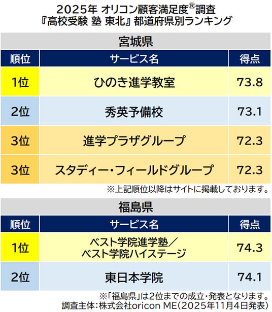 『高校受験 塾 東北』都道府県別ランキング(2025年 オリコン顧客満足度(R)調査)