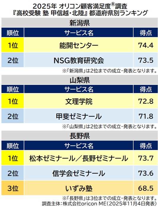 『高校受験 塾 甲信越・北陸』都道府県別ランキング(2025年 オリコン顧客満足度(R)調査)
