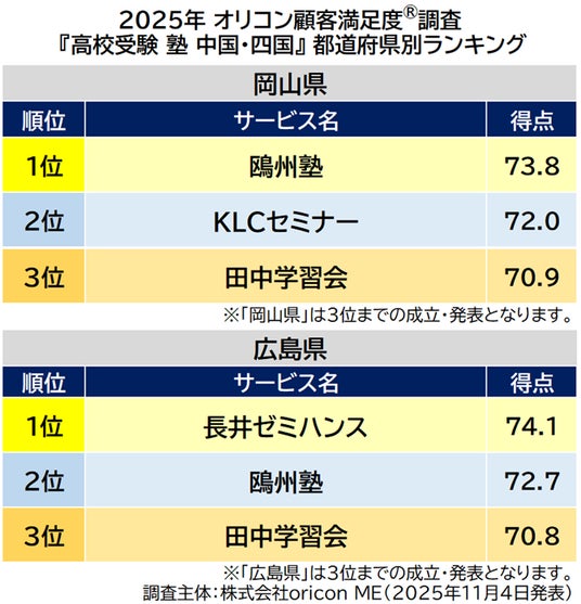『高校受験 塾 中国・四国』都道府県別ランキング(2025年 オリコン顧客満足度(R)調査)