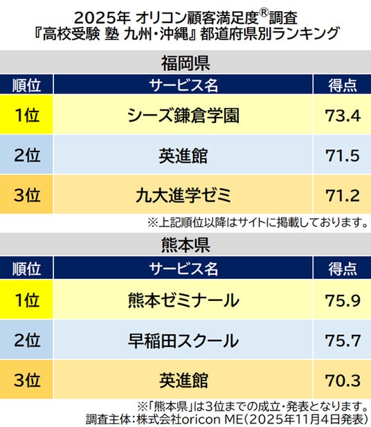 『高校受験 塾 九州・沖縄』都道府県別ランキング(2025年 オリコン顧客満足度(R)調査)