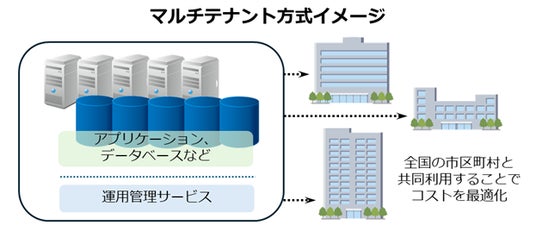 1.“共同利用”方式によるコストの最適化デジタル庁が推奨する「共同利用方式/アプリケーション分離」(マルチテナント)方式を採用し、それぞれの団体にかかるクラウド利用料の低減を目指しています。アプリケーションやデータベースなどを一つの団体で占有する方式と比べて、リソースを複数団体で共同利用するマルチテナント方式は大きなコスト按分効果が期待されます。