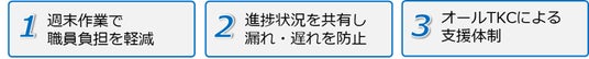 現地での移行作業やシステム検証、運用開始後の立ち合いに加え、専門部門による運用後の監視・保守・障害対応、コールセンター(TKCカスタマーサポートセンター株式会社)と連携した問い合わせ対応、納税通知書等の印刷や封入・封緘、発送までのアウトソーシングサービス(株式会社TLP)の提供――など、TKCグループが一丸となってサポートしています。