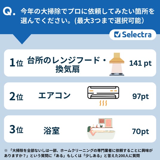 プロに掃除を依頼することに「興味がある」、「少し興味がある」と回答した200人の方に、家のどの部分の掃除をお願いしたか選んでもらいました。やはり定番の3か所、レンジフード、エアコン、浴室、この3つがトップ3に選ばれました。いずれもホームクリーニングサービスで人気の箇所です。