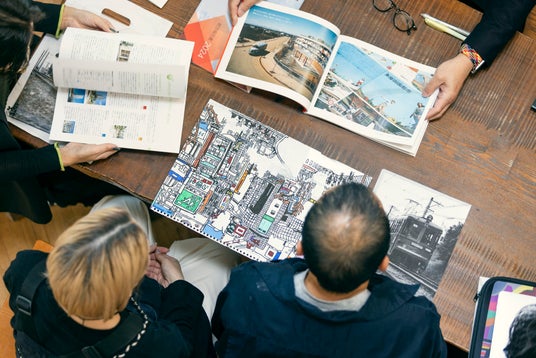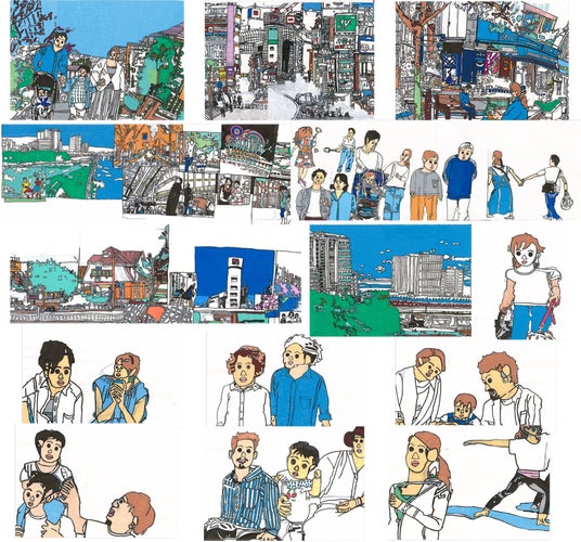 電車や乗り物が大好きな作家・中島敏也氏に、東急線沿線の街を描くオリジナルアートを依頼。実際に電車に乗り沿線の街や人々を体感し、独自のタッチで魅力を描きました。全14作品。作品名は全て「東急電鉄と風景」。