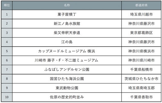 秋も深まり、行楽に最適なシーズンの到来です。今回は、東京駅周辺から片道約2時間以内で行ける関東の観光スポットについてアンケート調査を実施しました。気軽に楽しめそうなスポット第1位は埼玉県川越市にある「菓子屋横丁」でした。明治時代から続く駄菓子の名所で、石畳の通りに並ぶ約30軒の菓子店からは、せんべいや飴の香ばしい香りが漂い、懐かしい気分に浸れます。第2位は神奈川県藤沢市「新江ノ島水族館」。相模湾の海洋生物を紹介する水族館で、富士山や江の島を望む絶景とともに、1万匹の魚が泳ぐ大水槽やマイワシの群泳が圧巻です。第3位は東京都葛飾区の「柴又帝釈天参道」。草団子や佃煮などのお店が並ぶ下町情緒あふれる参道は、国民的映画の舞台としても知られ、古き良き日本の風景が今も残ります。この秋はランキング情報を参考に、週末のおでかけ先を見つけてみてはいかがでしょう。また、旅行情報サイト『じゃらんニュース』の記事では、TOP10以外にも魅力的な関東の観光スポットを紹介しています。ぜひチェックしてください。