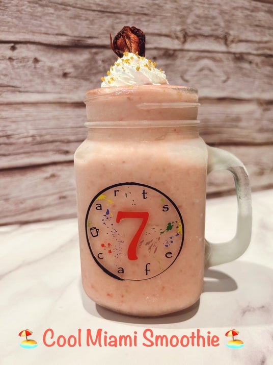 クールマイアミスムージー。植物由来の食材を使用しさっぱりとした口当たりの中にも濃厚な味わいを感じられる。ビタミン&ミネラルたっぷり。オーツミルク×バナナ×いちご×蜂蜜の栄養チャージドリンク。