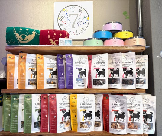 2023年発売。7dogmarketの新商品。犬向けスーパーフードを基にしたナチュラルトリーツは全7種類。