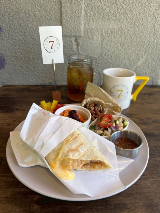 ベジタリアン・スイートチリ・パイナップル&玄米ブリトー。枝豆、玄米、にんじん、ピーマン…野菜たっぷり。7artscafe特製フムスやナッツのハニークラスターも添えて。