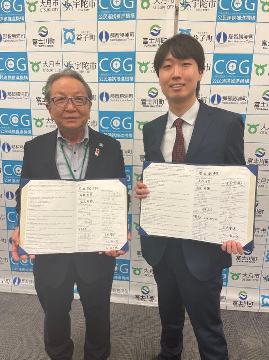 写真左 益子町長 広田茂十郎氏(写真右 REDEE株式会社 代表取締役社長 密山 裕貴)